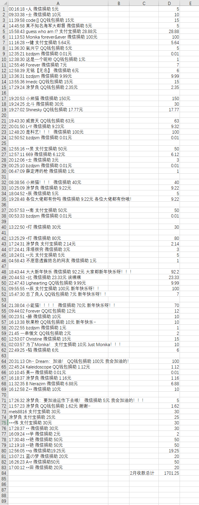 Atoria 2021年2月28日 12:19:18 **铯 微信捐助 50元 12:56:05 **α 微信捐助19.25元 13:07:21 蓝の梦 微信捐助 20元 16:26:23 A*r 微信捐助50元 17:00:12 **田 微信捐助 20元